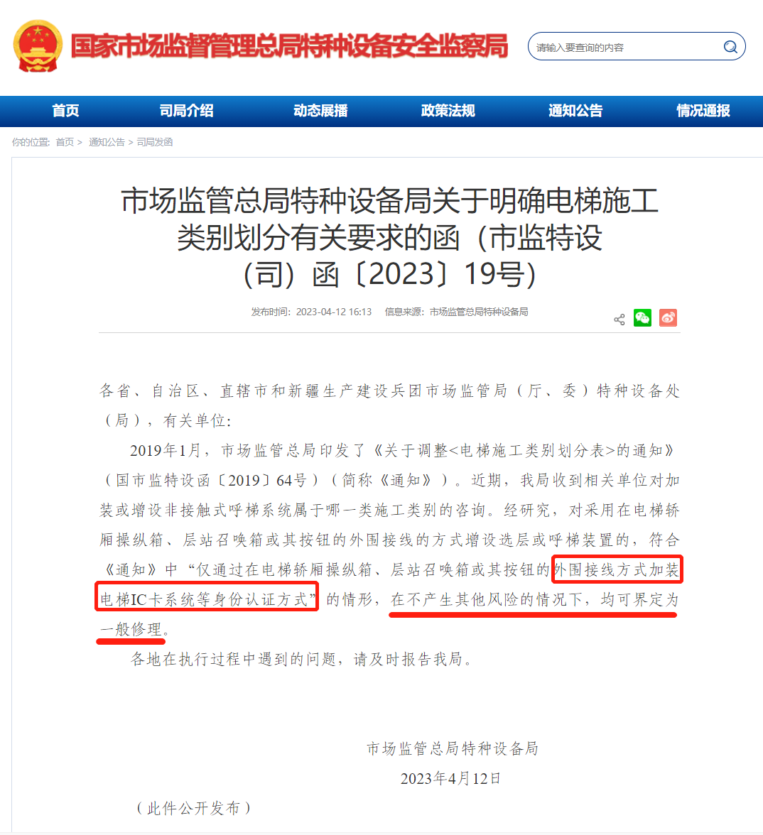 市場(chǎng)監(jiān)管總局特種設(shè)備局關(guān)于明確電梯施工類(lèi)別劃分有關(guān)要求的函(市監(jiān)特設(shè)(司)函〔2023〕19號(hào))