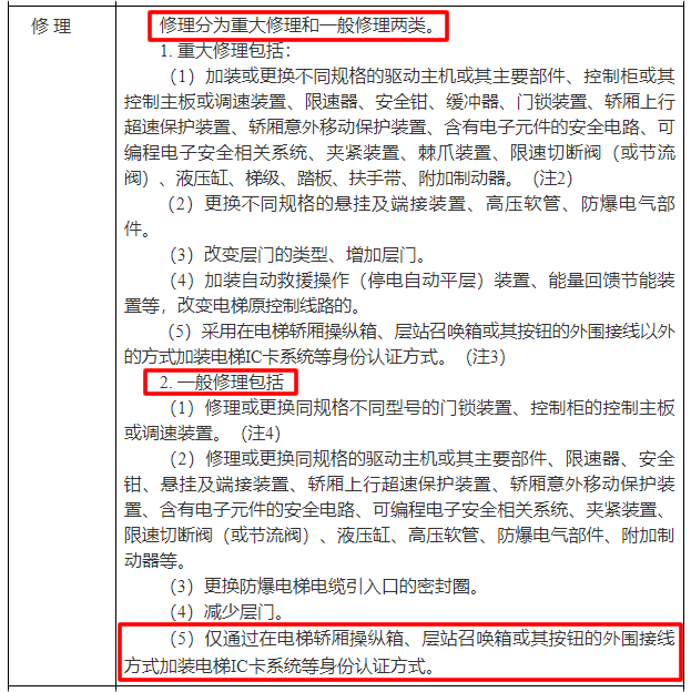 1. 重大修理包括:(5)采用在電梯轎廂操縱箱、層站召喚箱或其按鈕的外圍接線以外的方式加裝電梯IC卡系統等身份認證方式。